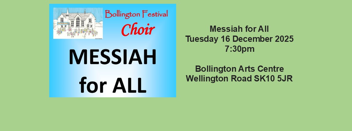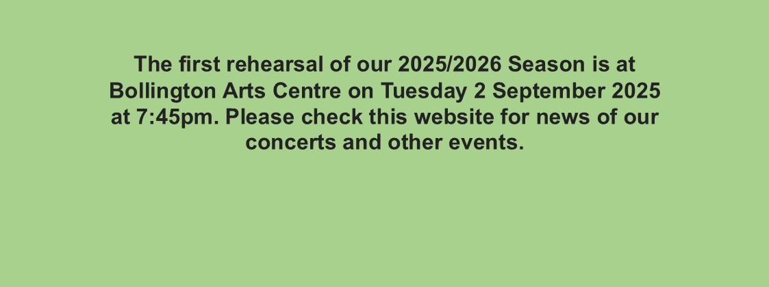Bollington Festival Choir’s first rehearsal of the 2025-2026 Season is at Bollington Arts Centre on Tuesday 2 September 2025 at 7:45pm. Please check this website for news of our concerts and other events.